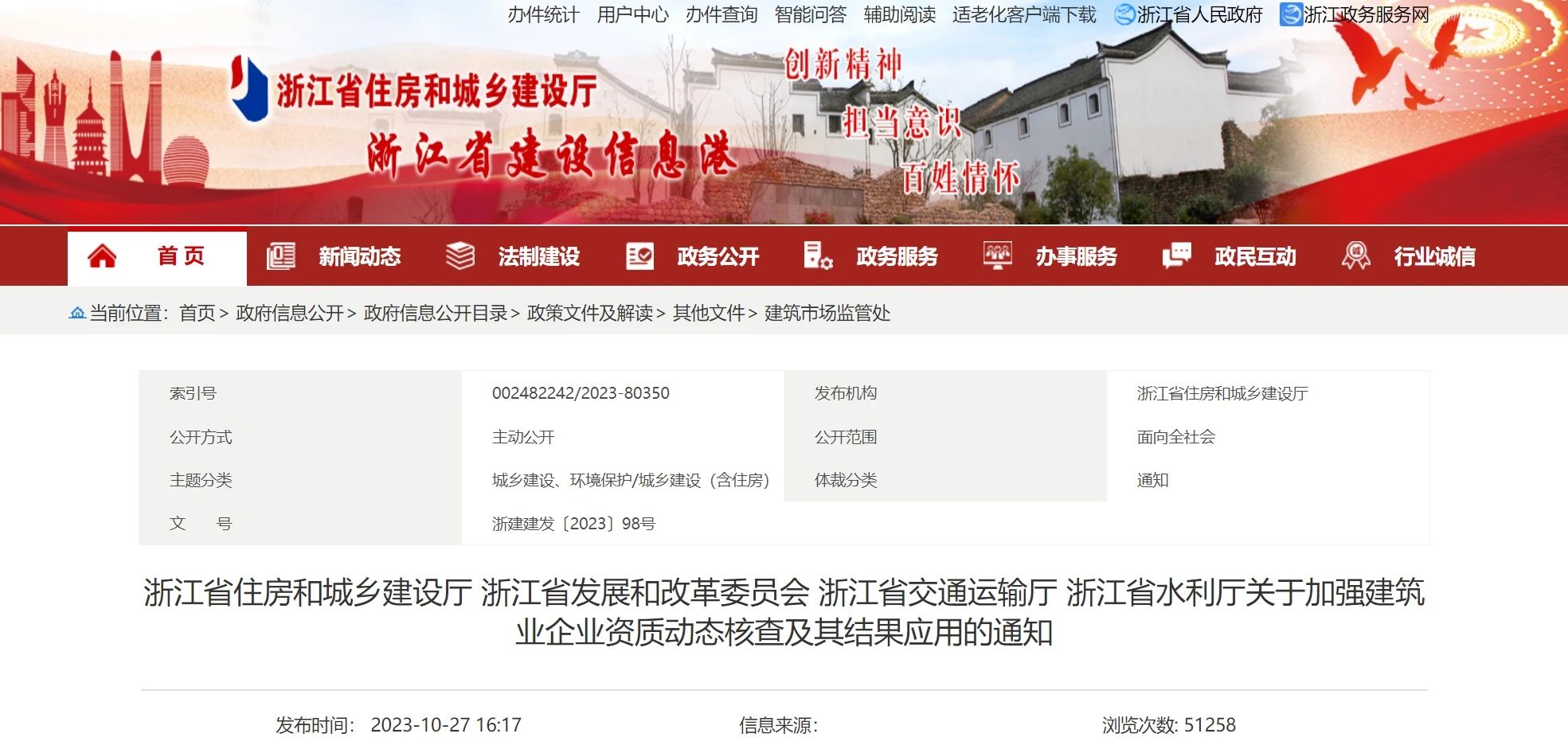 近日,浙江省住建廳聯(lián)合省發(fā)改委、浙江省交通運輸廳、浙江省水利廳等發(fā)布《關(guān)于加強建筑業(yè)企業(yè)資質(zhì)動態(tài)核查及其結(jié)果應(yīng)用的通知》(以下簡稱《通知》)。決定自2023年11月15日起,在房屋建筑和市政工程、公路水運工程、...