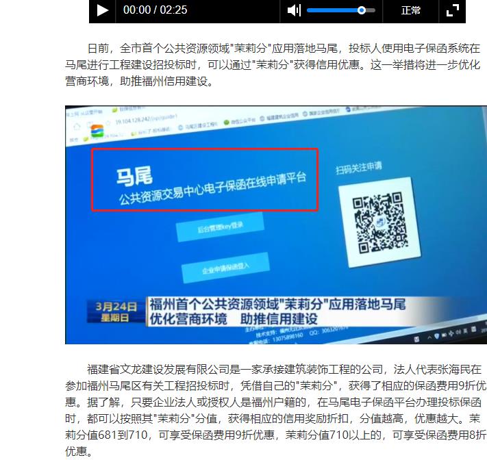 近日,投標(biāo)了電子保函平臺(tái)在福州市大數(shù)據(jù)委的大力支持下,應(yīng)用茉莉分為辦理保函的用戶提供信用優(yōu)惠措施獲得社會(huì)的廣泛關(guān)注,相關(guān)媒體給予了積極的報(bào)道,以下是相關(guān)報(bào)道簡(jiǎn)圖。