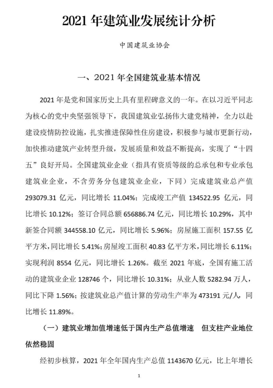 建筑業(yè)作為我國國民經(jīng)濟(jì)的支柱產(chǎn)業(yè),為推動國民經(jīng)濟(jì)增長和社會全面發(fā)展發(fā)揮了重要作用。隨著我國經(jīng)濟(jì)的快速發(fā)展以及人們對于房產(chǎn)建筑的剛性需求,我國建筑行業(yè)總產(chǎn)值逐年上升。下面,我們就一起來了解下2021年中國建筑行業(yè)發(fā)展統(tǒng)計分析報告。