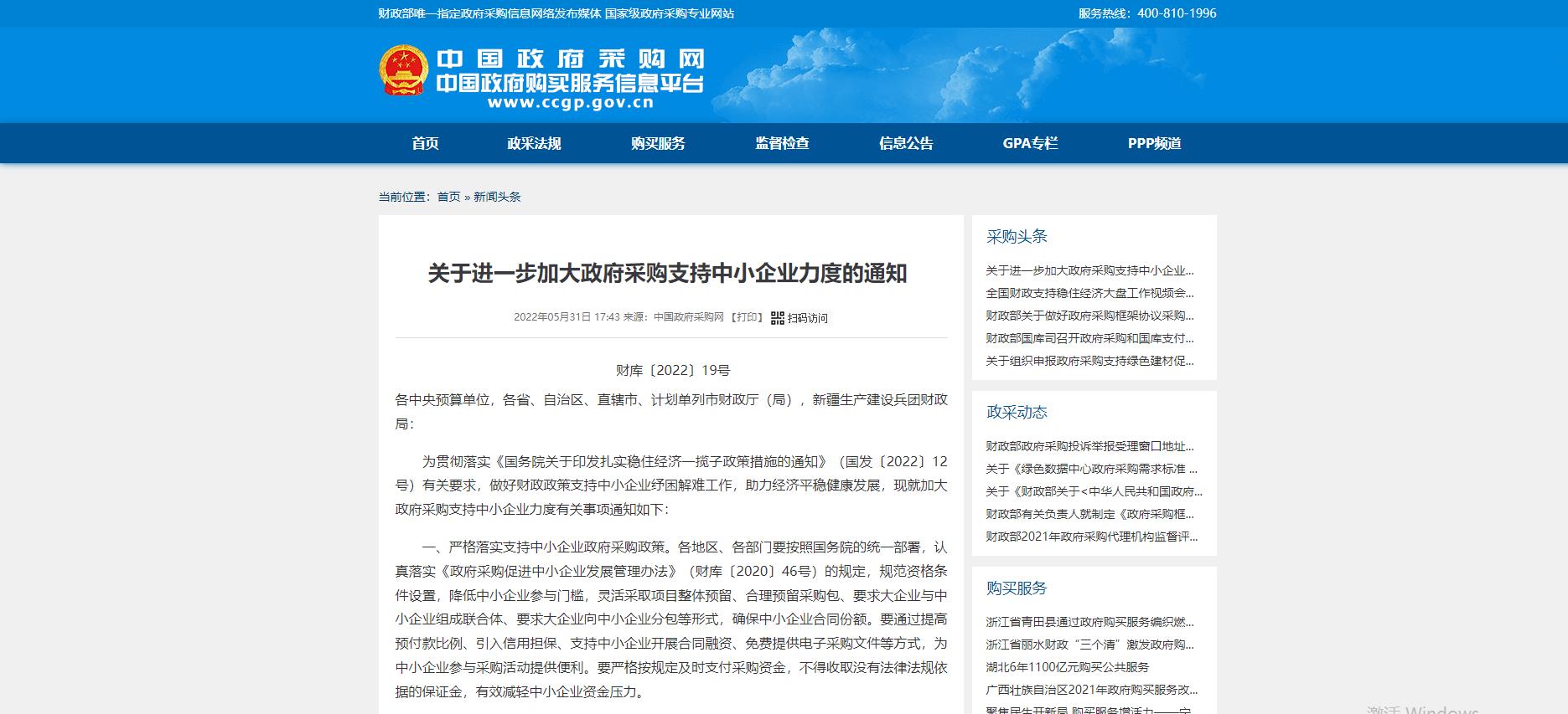 為貫徹落實《國務(wù)院關(guān)于印發(fā)扎實穩(wěn)住經(jīng)濟(jì)一攬子政策措施的通知》(國發(fā)〔2022〕12號)有關(guān)要求,做好財政政策支持中小企業(yè)紓困解難工作,助力經(jīng)濟(jì)平穩(wěn)健康發(fā)展,現(xiàn)就加大政府采購支持中小企業(yè)力度有關(guān)事項通知...
