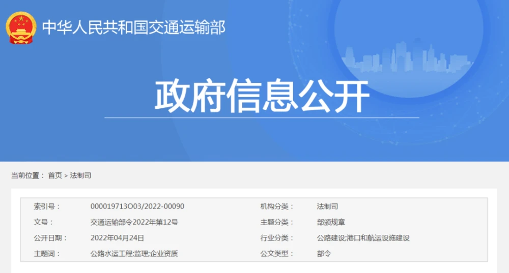 4月24日,交通運輸部官網(wǎng)發(fā)布《 公路水運工程監(jiān)理企業(yè)資質(zhì)管理規(guī)定(中華人民共和國交通運輸部令2022年第12號)》, 自2022年6月1日起施行!