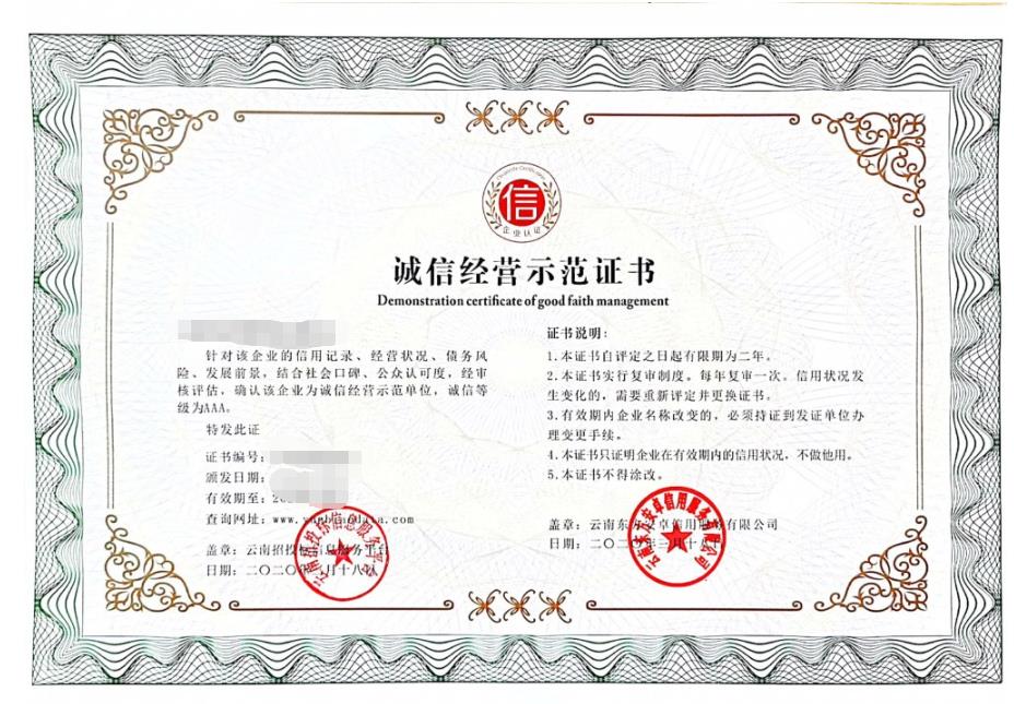 2、誠信經(jīng)營示范證書。