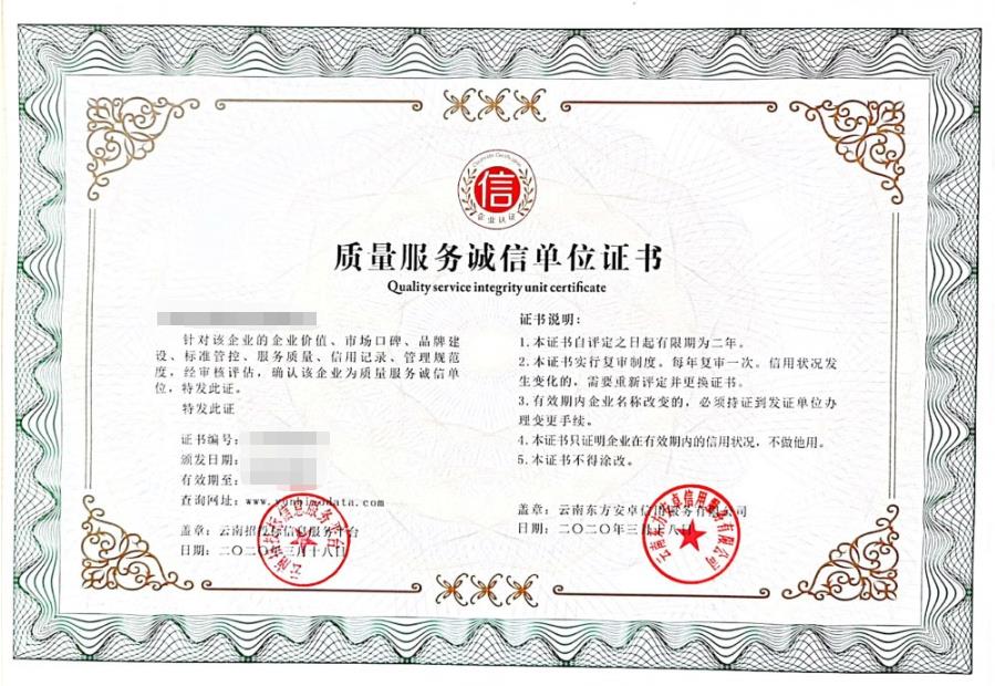 4、質(zhì)量服務(wù)誠信單位證書。