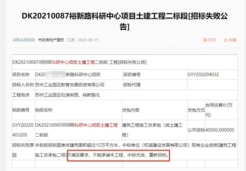招標(biāo)失敗原因顯示“本標(biāo)段招標(biāo)圖單體建筑面積超過15萬平方米,中標(biāo)單位現(xiàn)有企業(yè)資質(zhì)[建筑工程施工總承包二級(jí)]不滿足要求,不能承接本工程,中標(biāo)無效,重新招標(biāo)。”